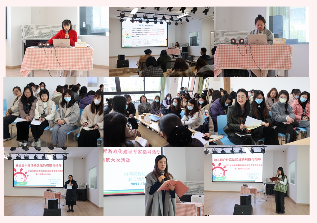 本次活动围绕户外区域活动中教师的观察与指导这一主题展开观察、研讨、交流。活动伊始,越江幼儿园保教处副主任唐晓文对本次活动流程以及越江幼儿园户外区域游戏的活动内容进行了简要介绍。在陈迎晓园长的陪同下,张晗教授及与会老师们观摩了越江幼儿园户外区域活动现场。观摩结束后,金家坝幼儿园、苏州大学附属吴江幼儿园、汾湖实验幼儿园、同里幼儿园、汾湖城区幼儿园五所幼儿园的教师代表依次对户外区域活动中教师观察的目标、内容、角度等进行分享交流。
