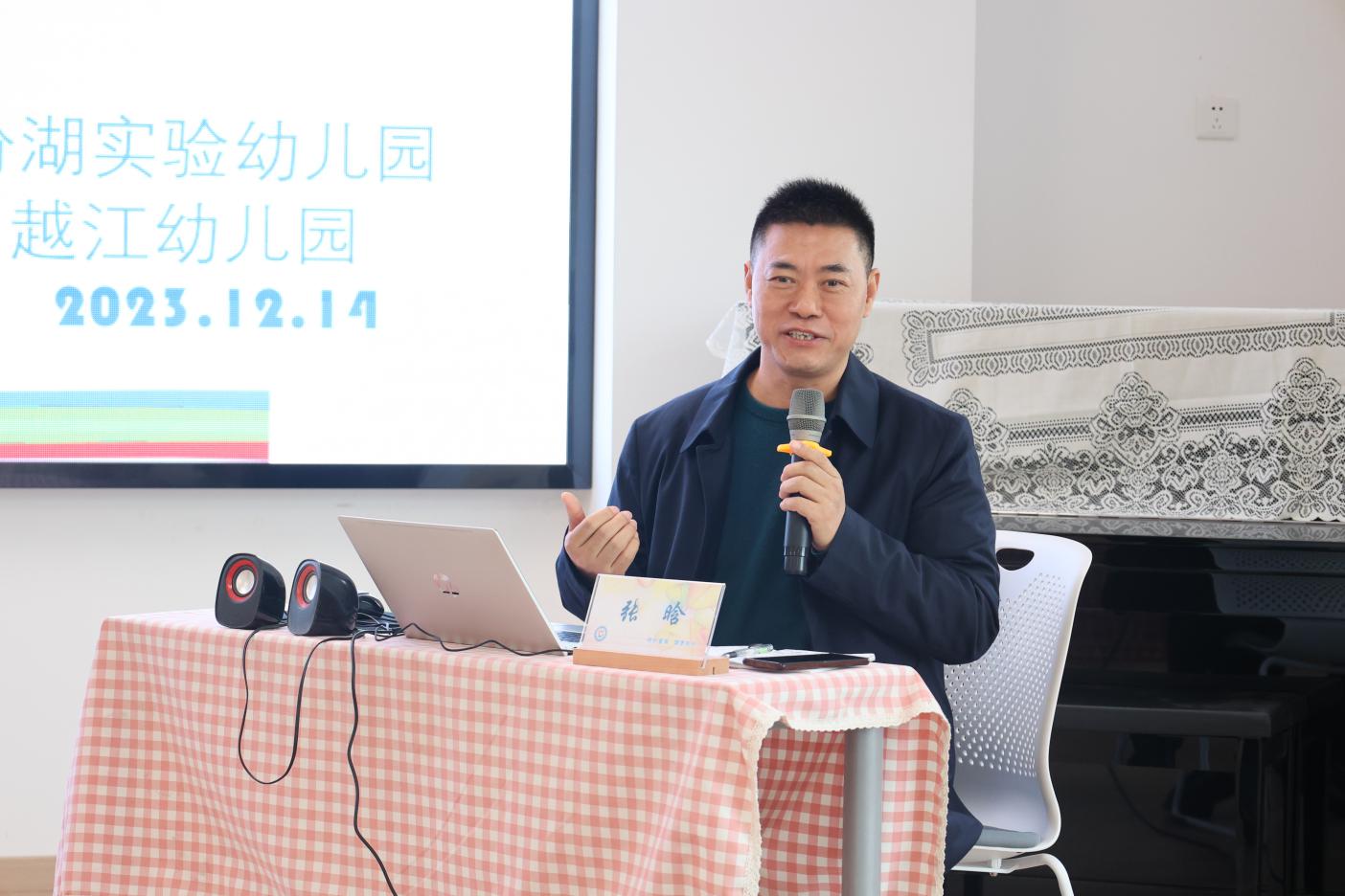 最后,张晗教授对本次活动进行了点评指导。张教授对越江幼儿园户外区域游戏开展情况、材料投放、幼儿投入度等给予了肯定。他表示很高兴看到了幼儿在活动中有积极愉悦的游戏状态,提出这正是户外游戏的价值所在。张教授强调了一定是从积极正面的视角观察幼儿,孩子在自然状态的活动中任何表现都是正常的,任何行为都值得被关注。