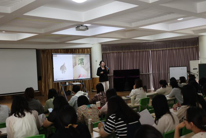 李老师以中华传统故事改编的绘本《漏》为切入点,在与老师们双向互动中,将听、感、想的教学手法立体呈现,让老师们体会带领幼儿进行绘本阅读的奥妙。同时介绍了绘本教学的四个步骤:一是“读懂绘本”,教师首先要阅读绘本,了解绘本内容,形成自己对绘本的理解。 二是“活动设计”,绘本要指向幼儿多领域发展,可以设计高低结构不同的活动。在绘本故事的延伸中还可有集体教学与区域活动的双向延伸。 三是“家园互动”,家园互动引导家长做幼儿阅读的陪伴者和倾听者,进一步促进亲子之间的关系。四是“环境创设”,良好的阅读环境能够激发幼儿对阅读的兴趣和欲望,并能养成良好的阅读习惯,同时能从不同的角度促进幼儿在情感、知识、能力、技能等方面的发展。